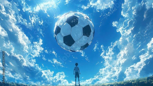Fototapeta premium Child Gazing at Giant Soccer Ball in Bright Blue Sky with Clouds