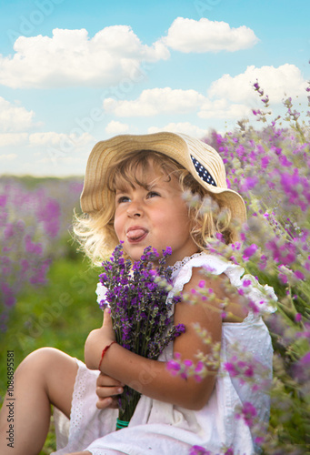 Fototapeta premium Child girl in lavender field. Selective focus.