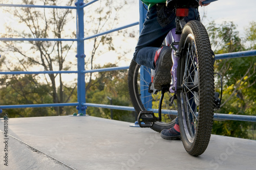 © Ольга Суровова, Obraz premium Child girl riding a bicycle in the park on a ramp slide.