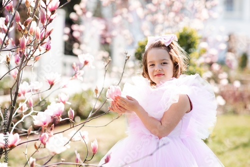 Fototapeta premium Child girl 5-6 year old smelling magnolia flower close up outdoors....