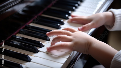Obraz premium child hands learning to play the piano, music school generative ai