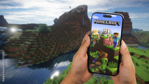 © Diego, Naklejka premium Child holding a smartphone iPhone 14 Pro with Minecraft mobile game app on the screen. Website blurred on background. Rio de Janeiro, RJ, Brazil. September 2022