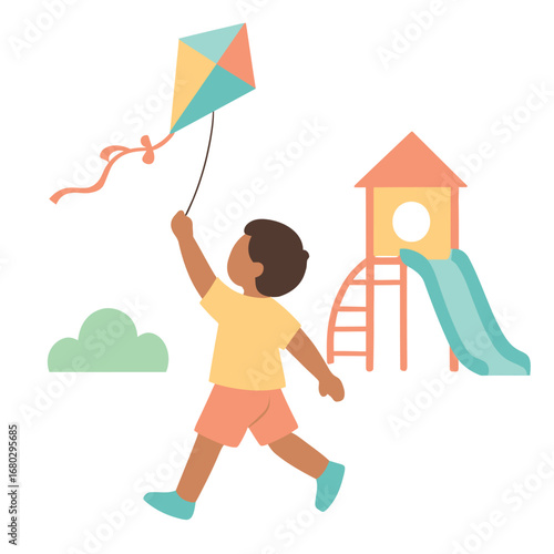 © Ramu888, Naklejka premium Child holding kite string in playground, clean vector design