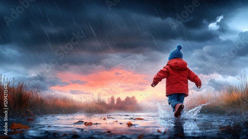 © khonkangrua, Obraz premium Child in Red Jacket Running Through Puddle on Rainy Day with Dramatic Sky and Colorful Sunset Background