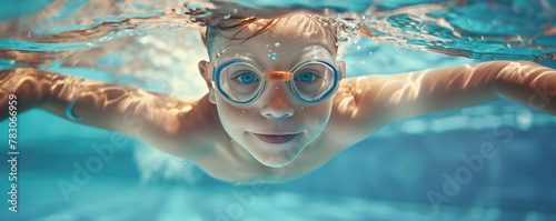 Naklejka premium Child in swimming goggles playing in the blue water. Concept of healthy lifestyle, family vacation and training of young swimmers.