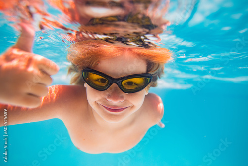 © Volodymyr, Naklejka premium Child in swimming pool underwater with thumbs up. Underwater kid swim in pool. Child boy swimming and diving underwater in pool. Summer family summer vacation with children. Underwater pool kids.
