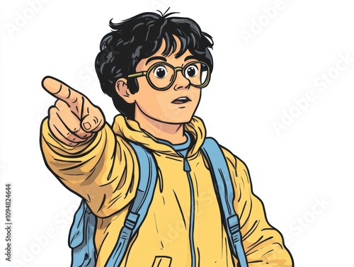 Obraz premium Child in yellow jacket pointing, white isolate background