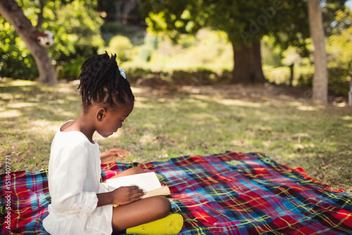 Naklejka premium Child is reading book on colorful plaid blanket on shaded grass under trees...