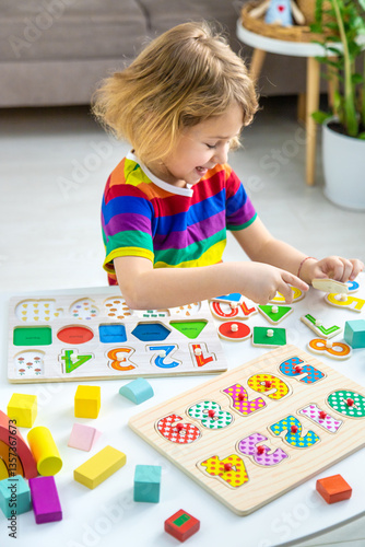 © yanadjan, Fototapeta premium Child learns numbers and letters. Selective focus.