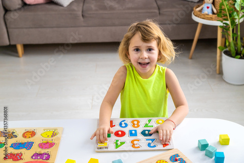 © yanadjan, Fototapeta premium Child learns numbers and letters. Selective focus.