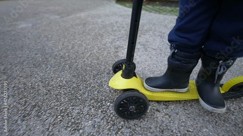 Obraz premium Child legs riding toy scooter outside wearing boots