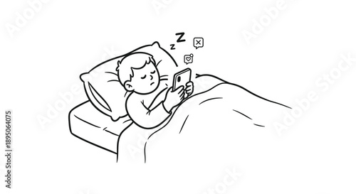 © Uzair Vector, Obraz premium Child lying in bed sleeping while using a smartphone at night