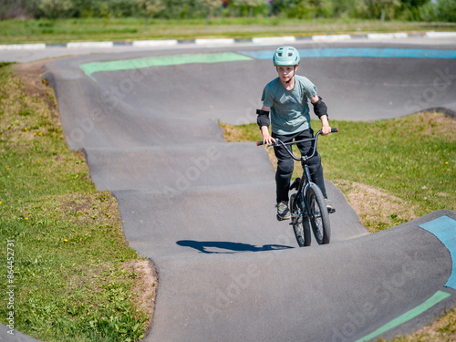 Fototapeta premium Child on bmx bike on pump track. Young male cyclist in helmet and protection rides bmx bike on asphalted bicycle race track. Boy BMX rider having fun and training on racing speed track. Extreme sport
