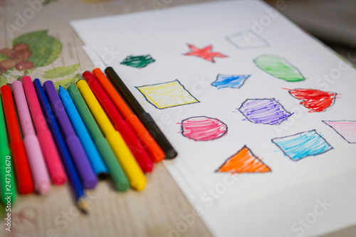 © Ivan, Naklejka premium child painting and coloring figures on white sheet at home.