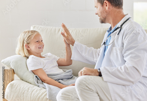 © peopleimages.com, Obraz premium Child, pediatrician and high five in home for wellness, joy and healthcare treatment in lounge. Girl, consultation and doctor in house for happiness, support and service in medical appointment as kid