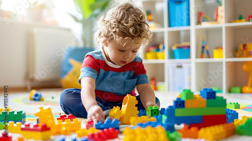 © Oleksandr, Fototapeta premium Child playing with colorful building blocks in a bright playroom