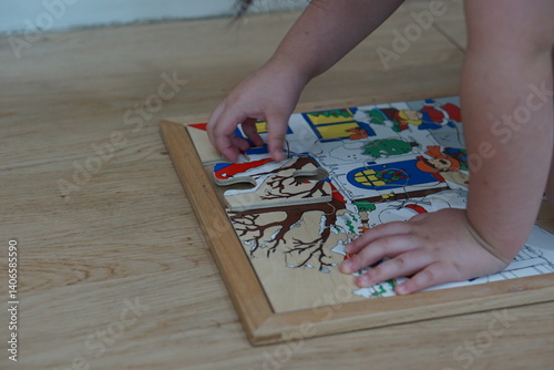 © MyDorkyDolphin, Obraz premium Child playing with wooden puzzle on the floor