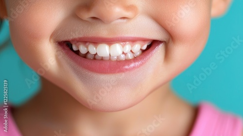 Fototapeta premium Child's bright smile, teal background, healthy teeth, dental care
