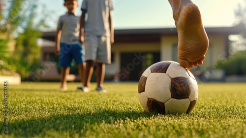 © Dhananjay, Fototapeta premium child's foot on a soccer ball in a yard