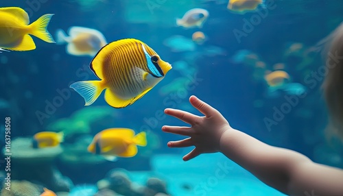 © gede, Naklejka premium Child's hand reaching towards a vibrant yellow and blue angelfish in a large aquarium. A captivating underwater scene filled with other tropical fish.