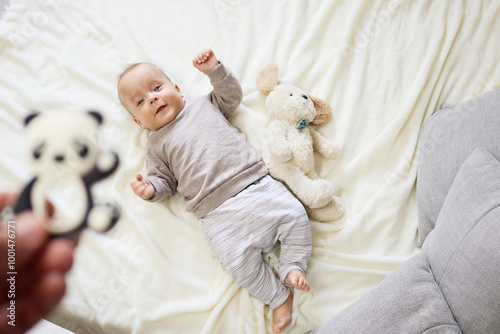 Obraz premium Child’s innocence. Relaxed childhood. Caucasian baby lying on bed in bedroom resting happily while unrecognizable mother showing tiny toy to infant son