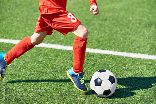 Fototapeta premium Child soccer player and ball on football field