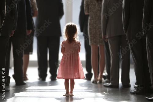 © Malika, Obraz premium Child Standing Alone Among Adults in Long Public Line at an Event