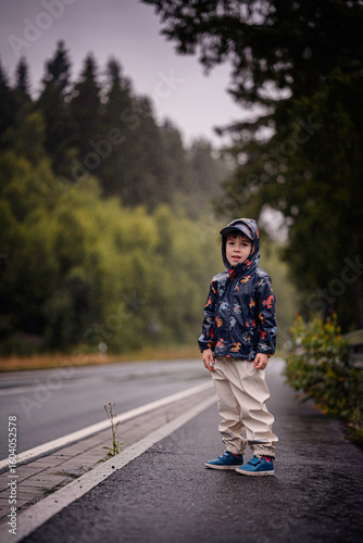 © Иванна Емельянова, Obraz premium Child Standing by Wet Road in Rainy Forest Setting