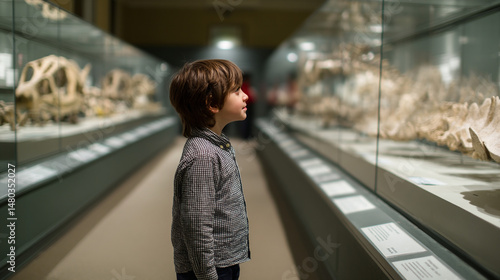 © Vika art, Fototapeta premium Child standing in a paleontological museum.