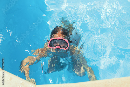 © Shopping King Louie, Naklejka premium Child swims in pool underwater, happy active girl in snorkel goggles has fun in water