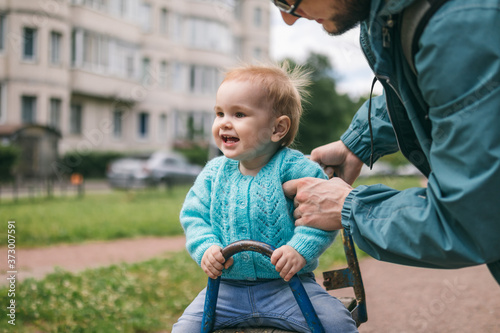 © Полина Власова, Fototapeta premium Child swinging on the seesaw walks with his father