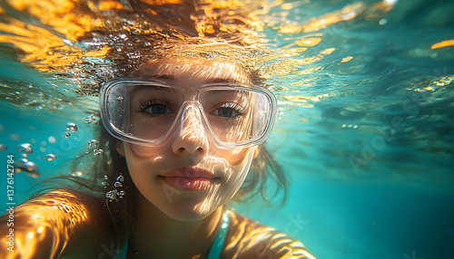 © Nesa, Fototapeta premium Child underwater selfie swimming fun