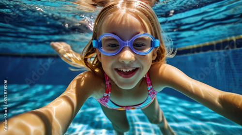 © triocean, Fototapeta premium Child wearing swimming goggles and enjoying hot summer day in the swimming pool