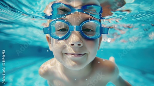 © soem, Naklejka premium child 6 years old on swimming lesson in a swimming cap and goggles swims kissing water in swimming pool
