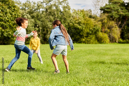 Fototapeta premium childhood, leisure and people concept - group of happy kids playing tag game and running at park