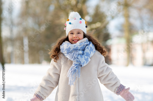 Obraz premium childhood, leisure and season concept - portrait of happy little girl in winter clothes outdoors at park