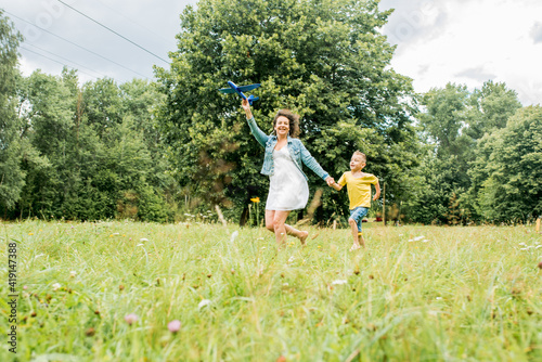 © irishasel, Obraz premium Childhood memories. Active leisure with kids. Kid pilot having fun on meadow. Summer leisure.freedom and dream concept