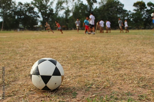 © Rungnapa, Fototapeta premium Children are playing football on the field in the evening after school, taking blurred pictures