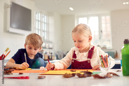 Fototapeta premium Children At Home Doing Craft And Making Picture Or Card From Leaves In Kitchen