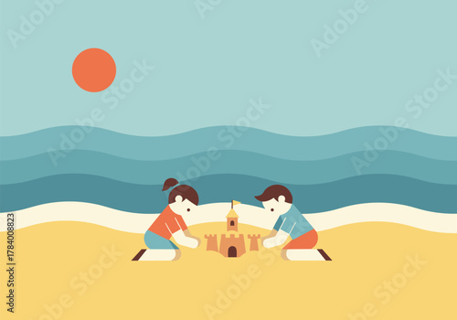 © 4Max, Fototapeta premium Children building sandcastle on sunny beach with waves in background