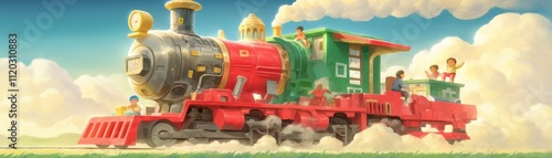 Fototapeta premium Children Building Toy Houses with a Train on Tracks Creative Playtime Moments Captured in a Professional Stock Photography Style