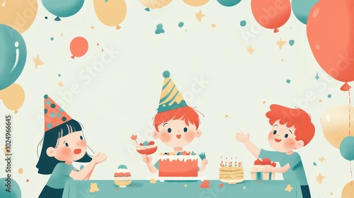 © BerkahStock, Fototapeta premium Children celebrating a birthday with cake and balloons in a festive setting.