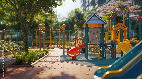 Fototapeta premium Children delight in the diverse toys of the playground--slides, swings, and...