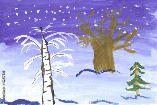 © strekalova, Fototapeta premium Children drawing winter landscape.