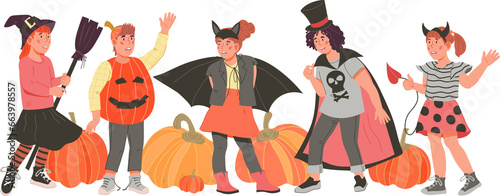 © Мария Гисина, Naklejka premium Children dressed in Halloween fancy costumes to go trick or treating and celebrate Halloween party standing with pumpkins.