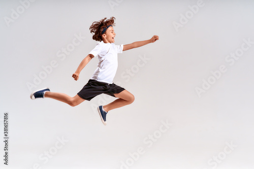 Fototapeta premium Children engaged in sport. Full-length shot of a teenage boy jumping isolated...