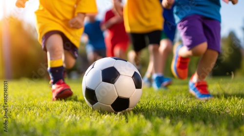 © Gasspoll, Obraz premium Children Engaging in Dynamic Outdoor Soccer Activity on a Sunny Day