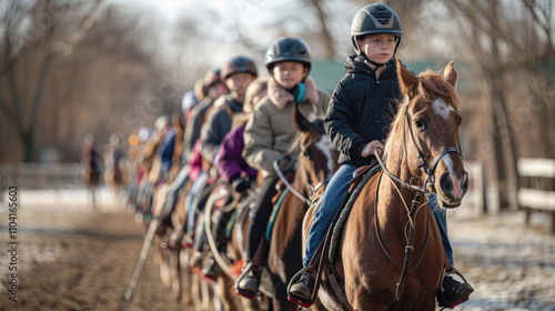 © Preeyada, Obraz premium Children Enjoying Horseback Riding in a Scenic Outdoor Setting on a Sunny Day with Trees in the Background