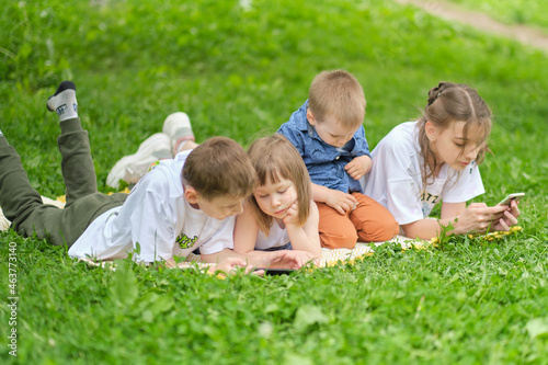 © yavdat, Obraz premium children friend group playing internet with mobile smartphone on grass. Happy children using smartphones sitting on the grass. Brothers and sister.