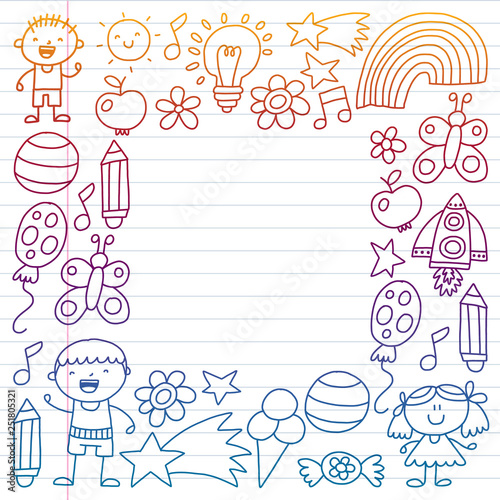 © Cepheia, Fototapeta premium Children garden, Patern, Hand drawn children garden elements pattern, doodle illustration, Vector, illustration, Vertical, gradient.